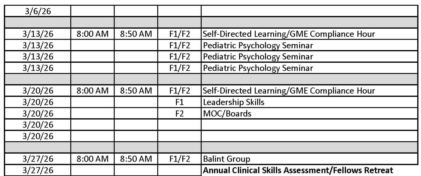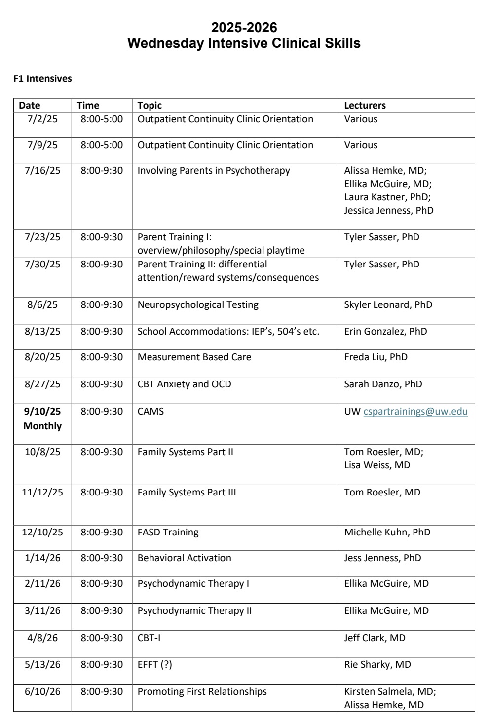 First-year fellows only. This series includes didactics or training in behavioral interventions in school settings, family systems therapy, CBT, neuropsychology and IEP/504 concepts, psychodynamic psychotherapy, Fetal Alcohol Spectrum Disorders and parent training.