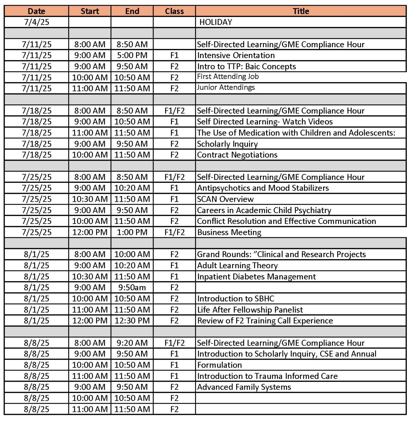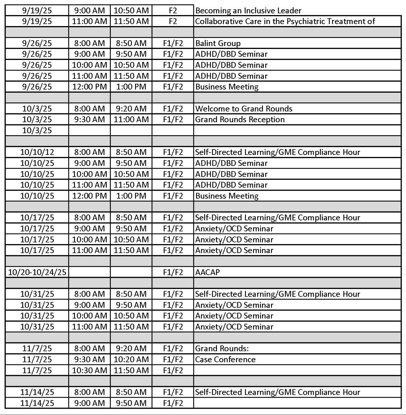 Throughout the two year fellowship program, all fellows participate in a series of seminars each Friday morning. The series begins with an extensive clinical orientation and follows with a month-long typical development seminar, then proceeds with an extensive series of seminars spanning child and adolescent psychopathology, social and structural determinants of health, ethics, forensics, neuroscience, genetics, integrated care, complementary and integrative medicine, and more. First-year residents will also participate in 2-hour Clinical Intensives on Wednesday mornings designed to teach practical skills for evaluating and treating children and their families.