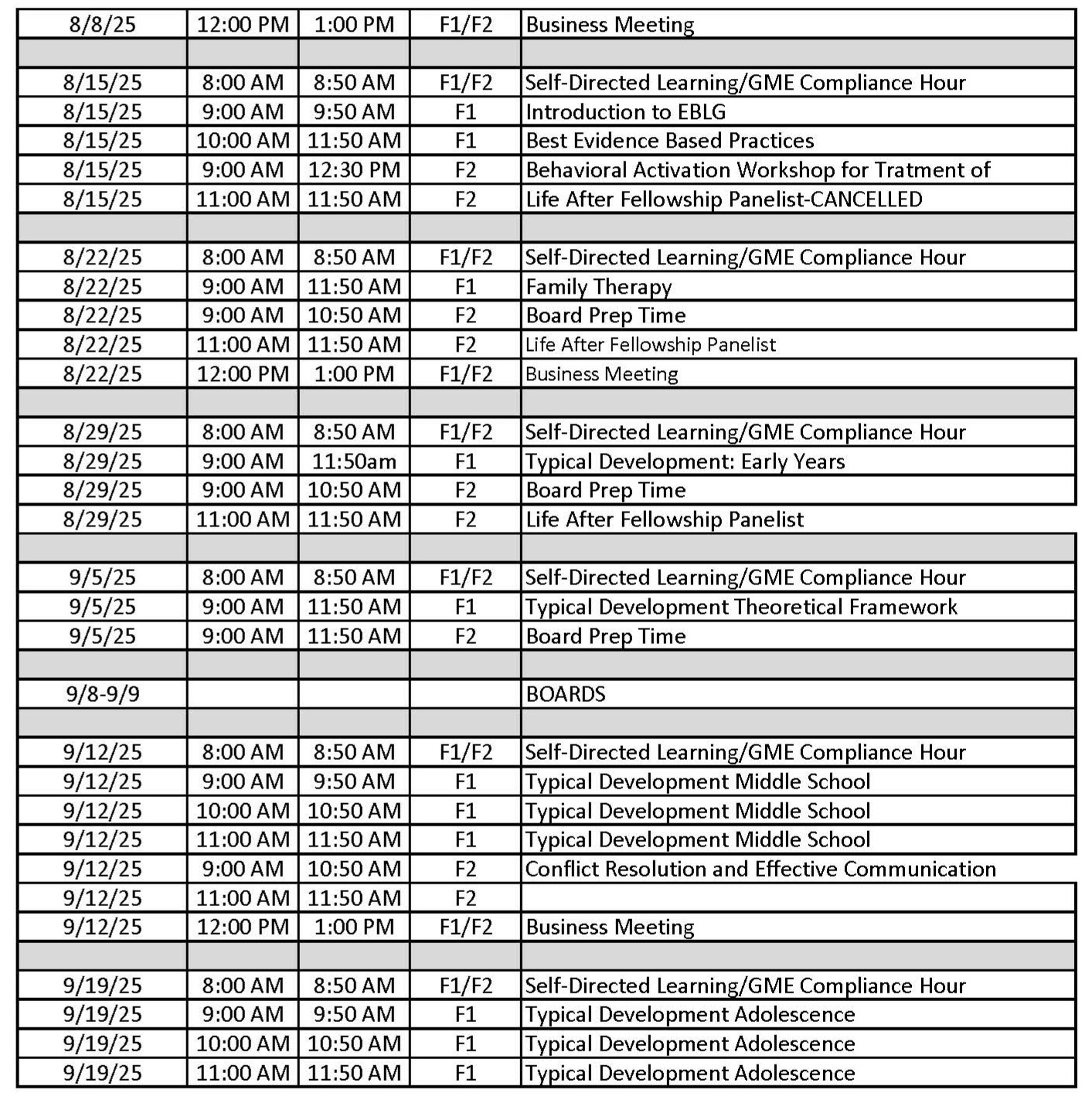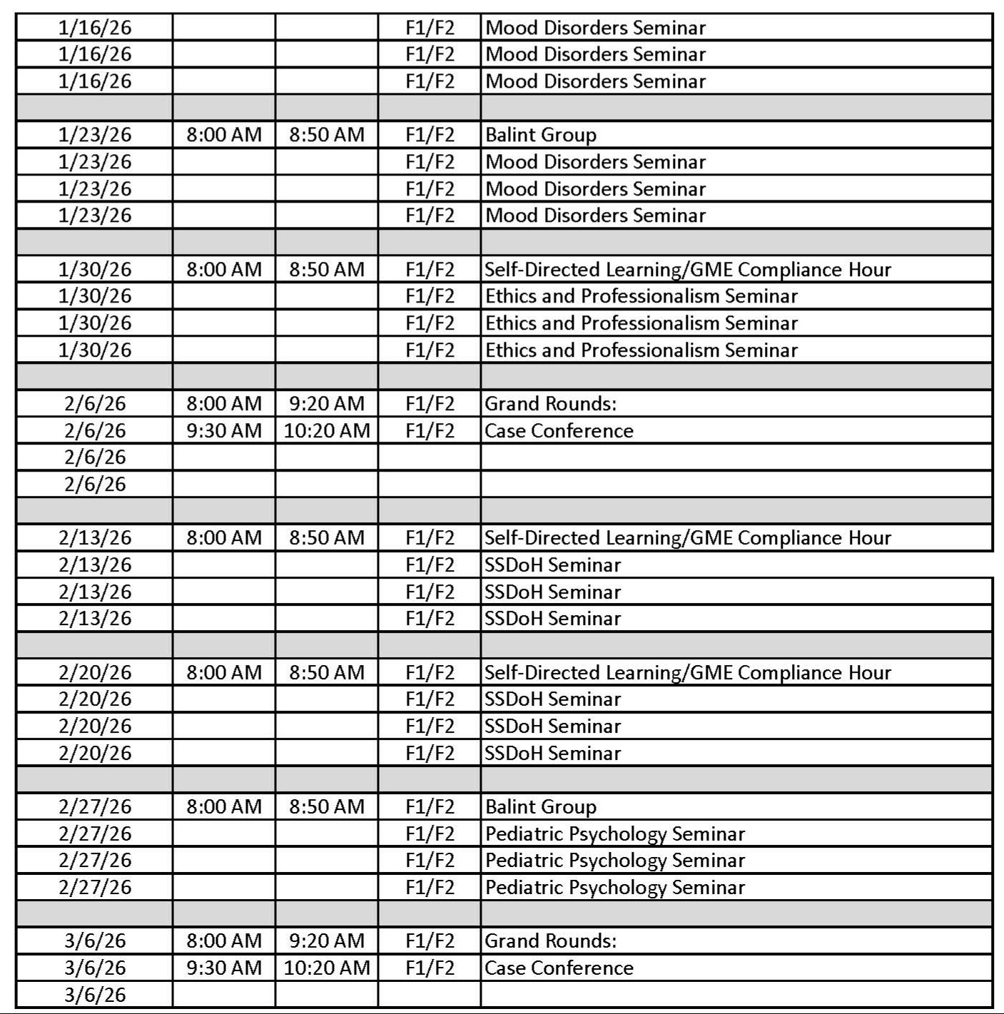First-year fellows only. This series includes didactics or training in behavioral interventions in school settings, family systems therapy, CBT, neuropsychology and IEP/504 concepts, psychodynamic psychotherapy, Fetal Alcohol Spectrum Disorders and parent training.