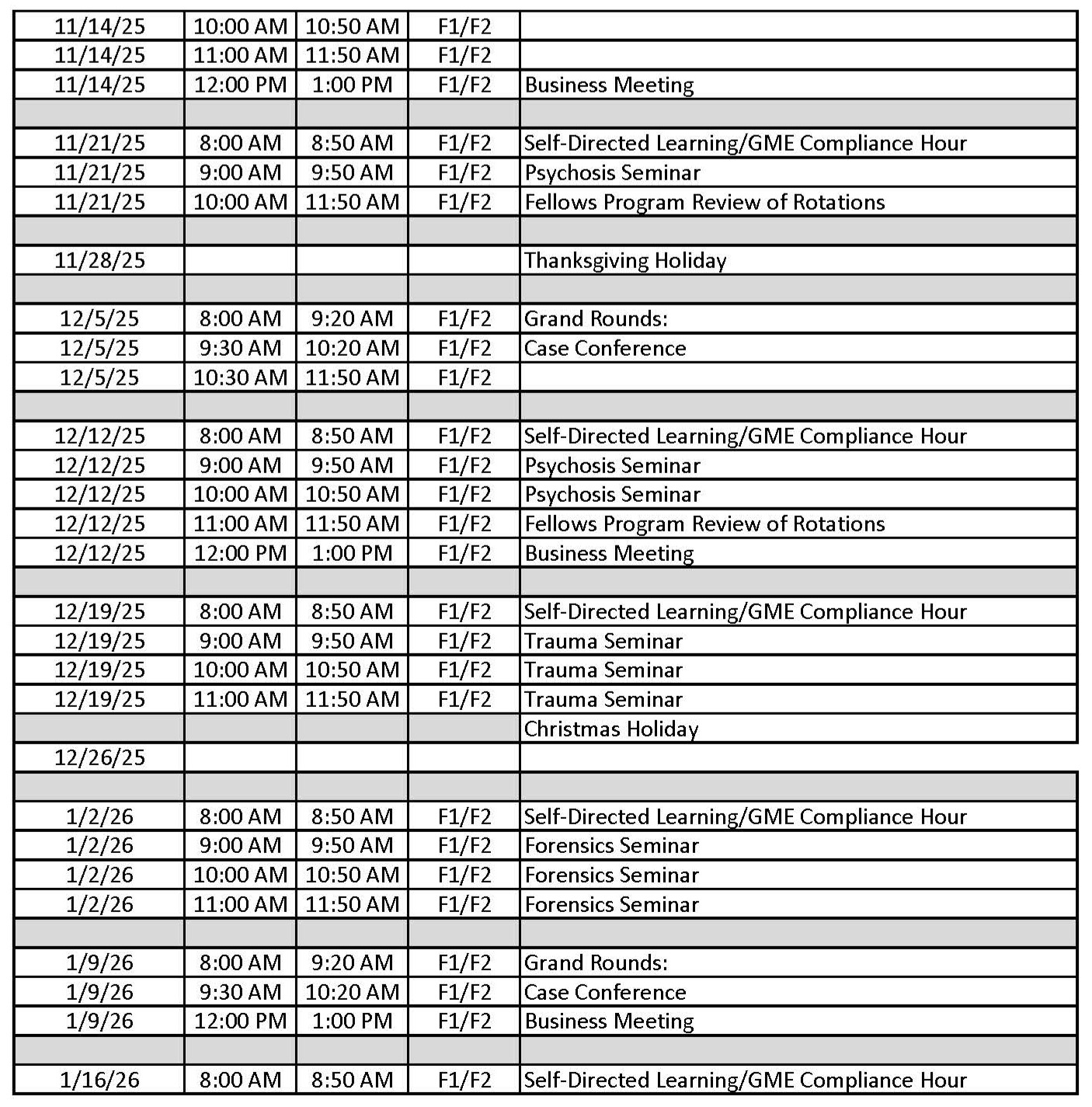 Second-year fellows only. Fellows learn about the different aspects of contract negotiation, transition to practice, financial literacy and planning for becoming an attending psychiatrist.