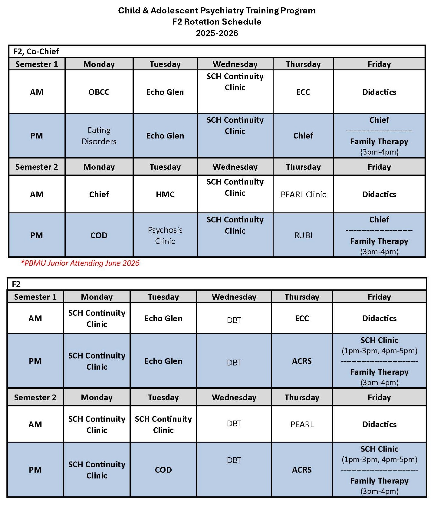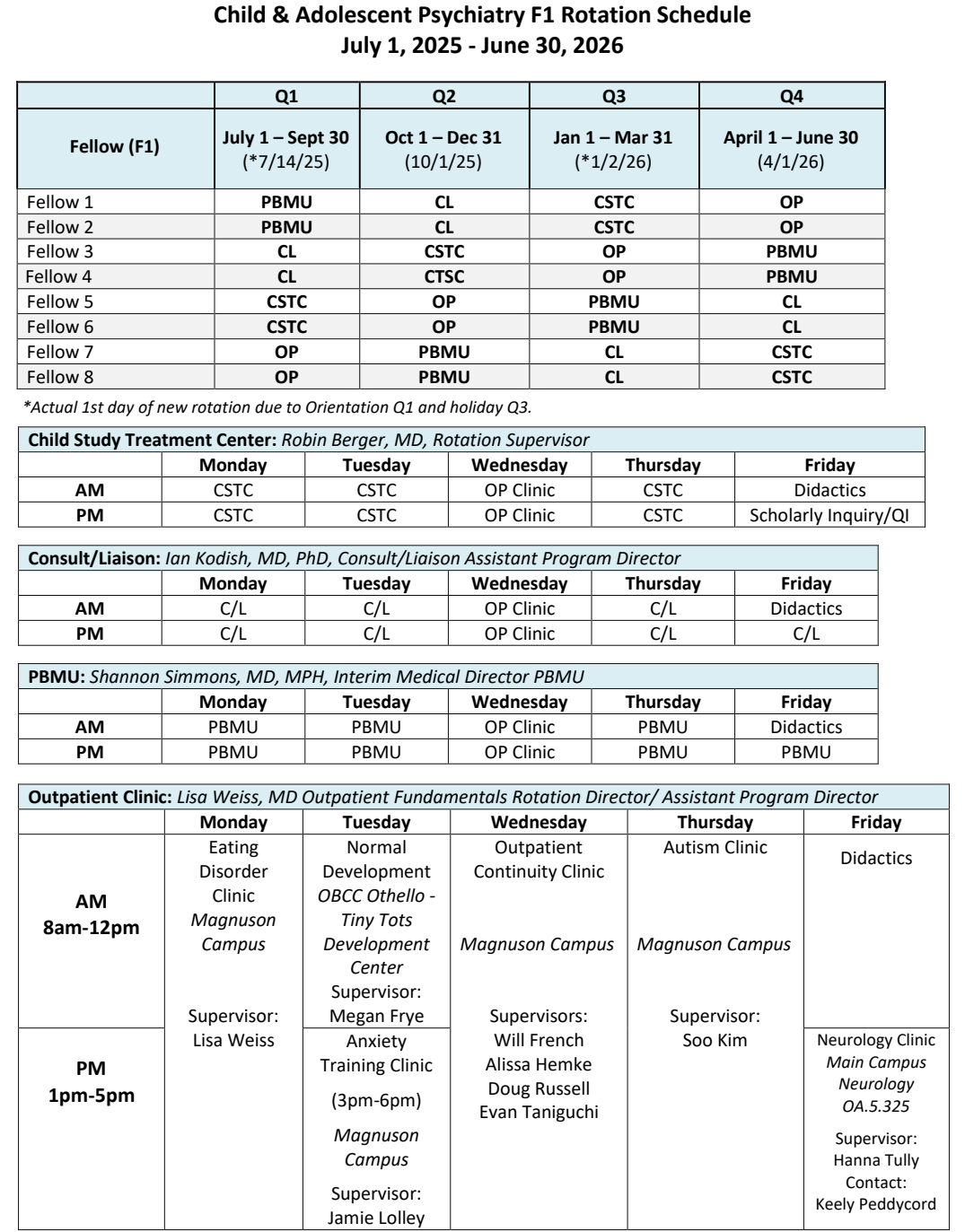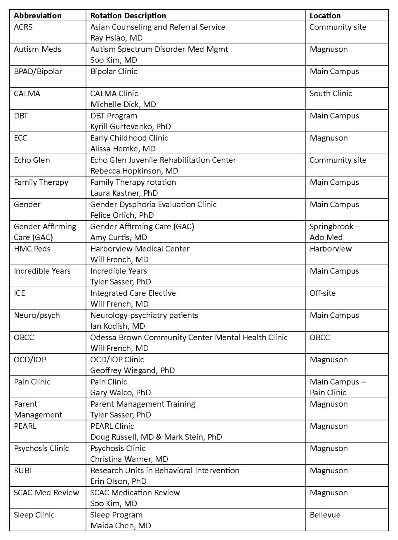 The 1st year of the 2-year Child and Adolescent Psychiatry Residency is divided into four blocks, each of 3 months duration. For a full description of the Seattle Children’s Hospital and CSTC, including individual departments, units and specialty services, please refer to our Training Sites page.