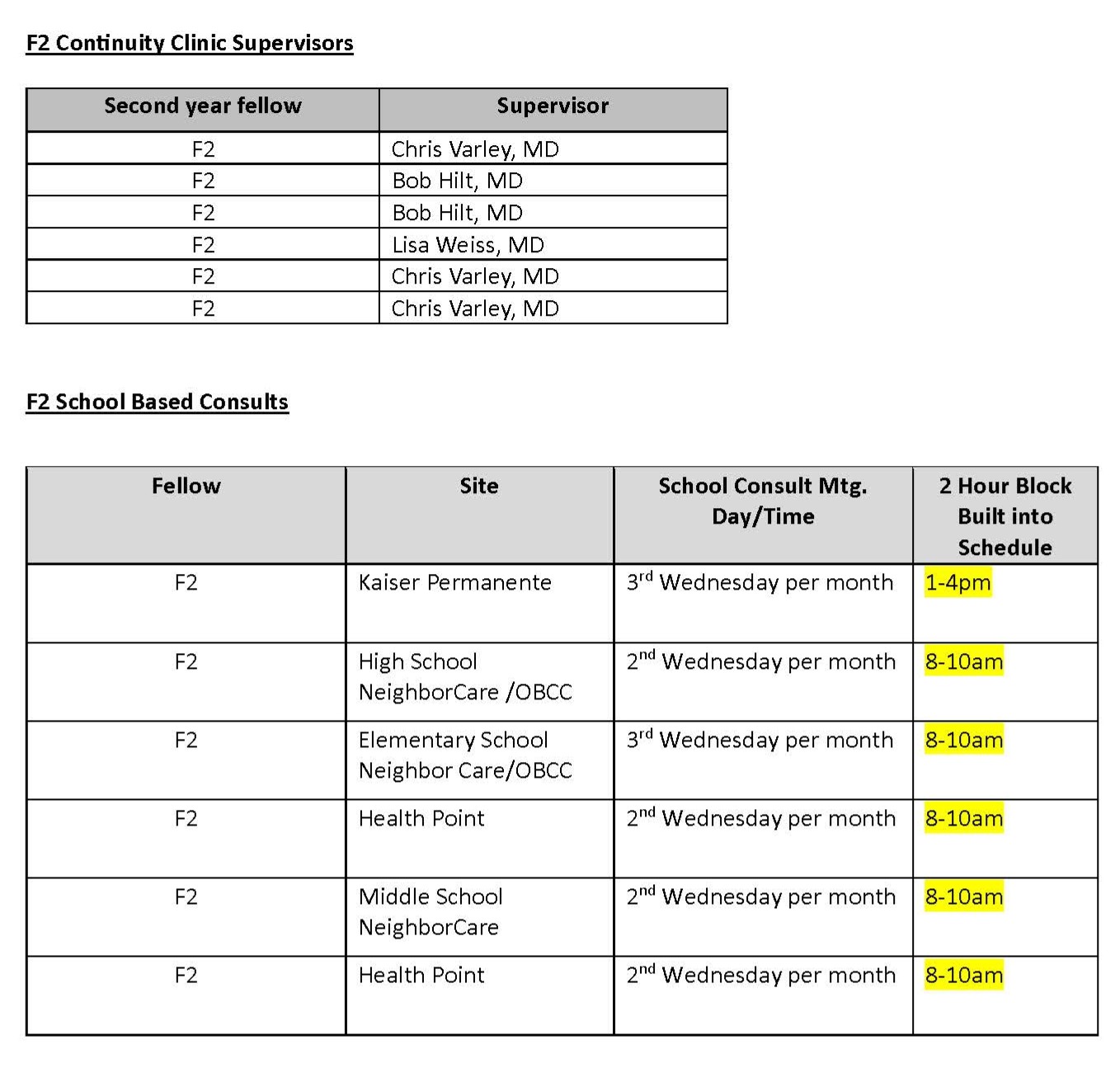 Fellows have their continuity training clinics on Wednesdays throughout both years of training. This clinic offers fellows a chance to experience long-term continuity care with both weekly therapy patients and medication management cases that are seen less frequently. Fellows also have 1 hour of medication management supervision and 1 hour of CBT psychotherapy supervision each Wednesday built into their clinic schedules.